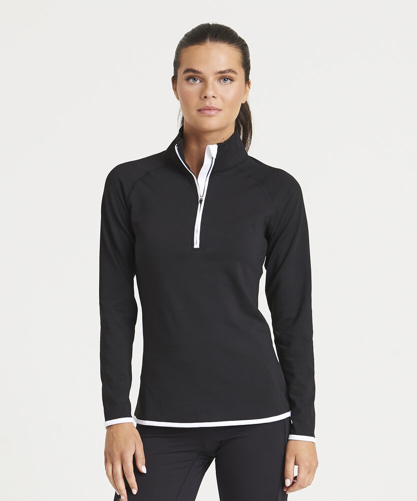 AWDis' own CoolFit blended fabric containing elastane that provides stretch for comfort and a great fit, girlie fit, reflective tab at back of neck helps keep ear phone cords in place, self-fabric contrast colour binding at zip, cuffs and hem, raglan sleeve design creates ease of movement, 1/2 zip with stand-up collar for warmth, chin guard prevents irritation, simple tear off label makes it perfect for rebranding, UPF 30+ UV protection.